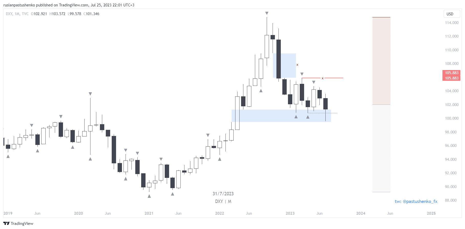 Беря во внимание график DXY, упомянутые выше факторы вполне вписываются в сценарий в среднесрочной перспективе вырасти до значения 105 и более. По всё тем же выше проанализированным факторам, позиции евро к доллару имеют все шансы ослабиться в рамках второй половины 2023 - начала 2024 года.