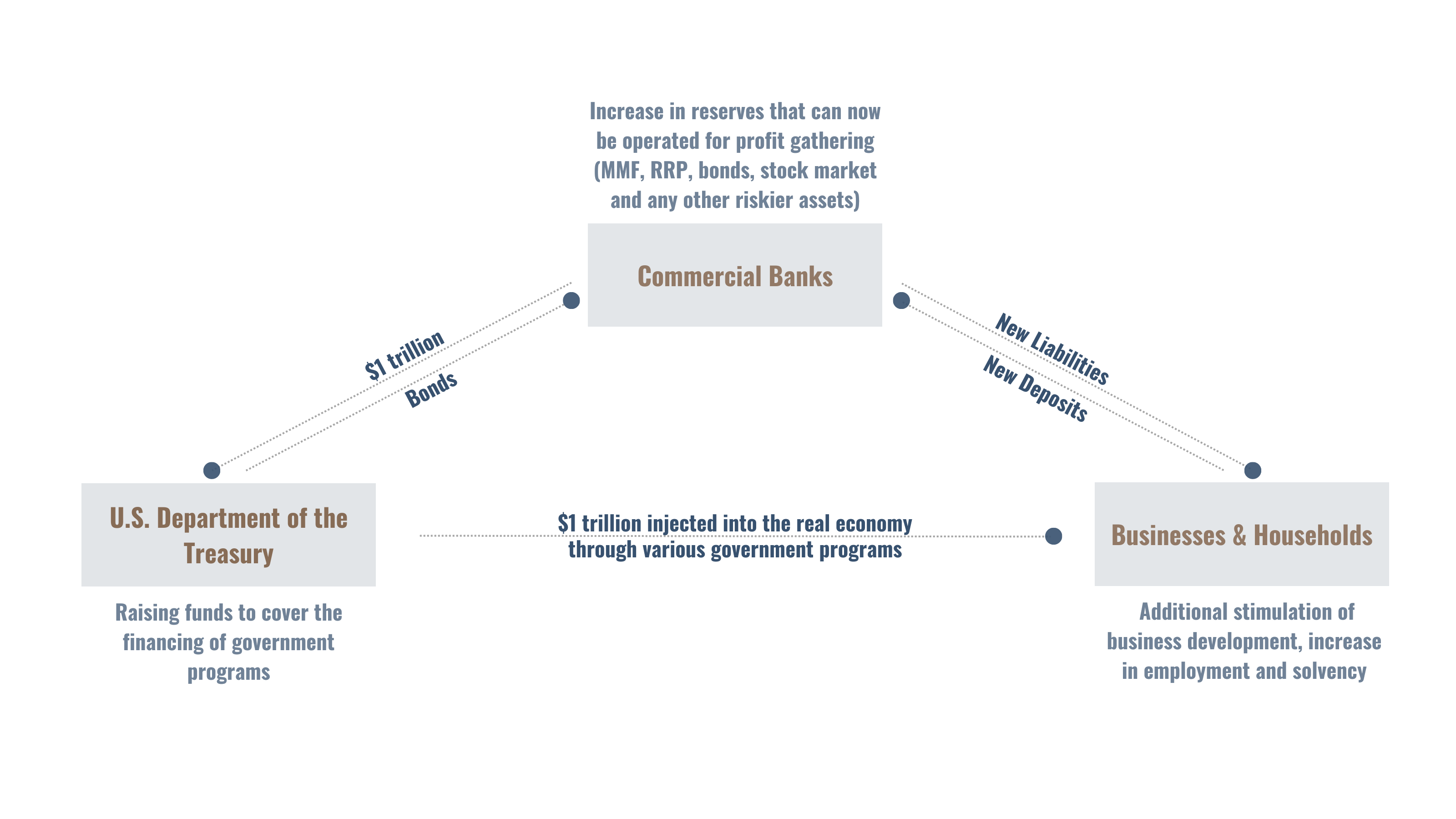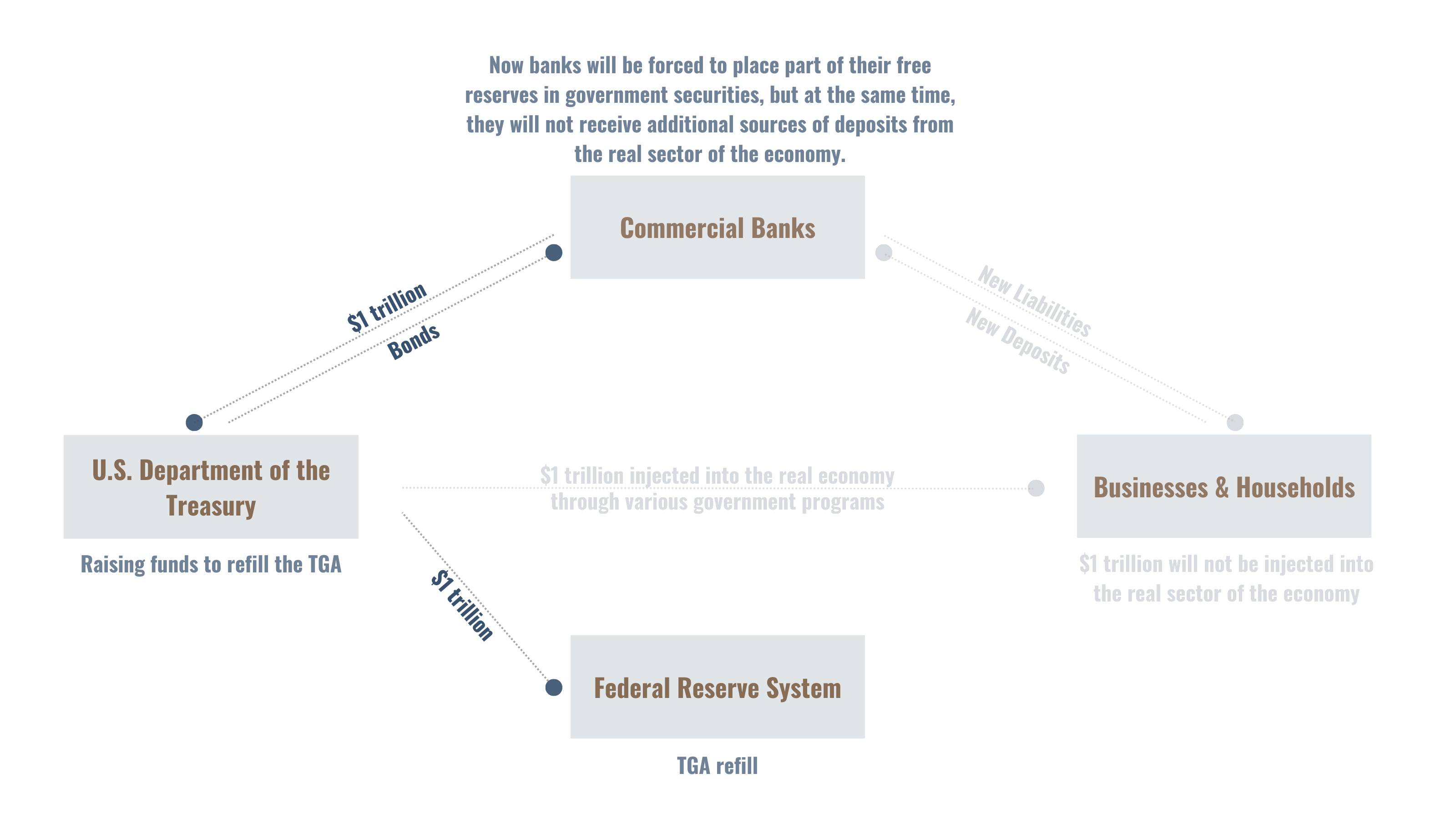 По-перше, Казначейство має випустити облігації з метою поповнення балансу свого рахунку для підтримки здорового рівня операційної діяльності. Бачимо перше нестикування — гроші в сумі нашого умовного $1 трлн. у реальний сектор економіки не підуть.