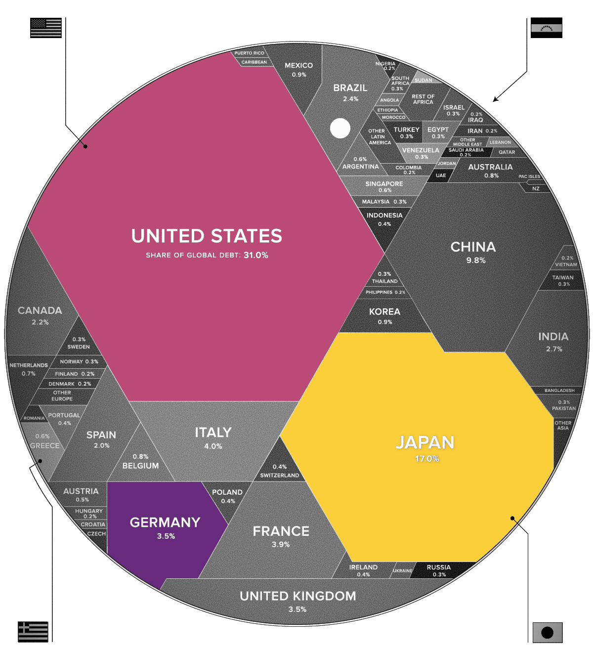 Важливо відзначити, що розмір державного боргу сам по собі не є визначальним чинником його впливу на економіку країни. Вирішальне значення мають здатність країни виплачувати відсотки за боргом та своєчасне його погашення. Щоб було зрозуміліше, коротко розглянемо це на прикладі кількох країн.
