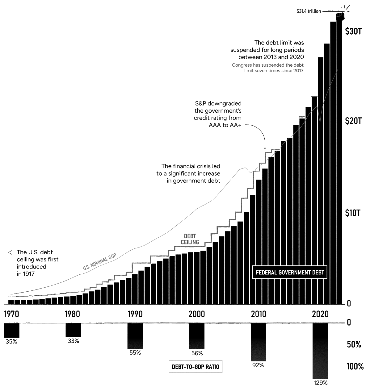 З того часу стеля державного боргу періодично підвищувалася або змінювалася законодавчо. Це дозволяло уряду США продовжувати позичати гроші та покривати бюджетні витрати, не перевищуючи встановленої стелі і відповідним чином не порушуючи жодних юридичних норм. Після закінчення Другої світової війни він ліміт був змінений понад 100 разів. Так, ні на що не натякаю, просто до слова.